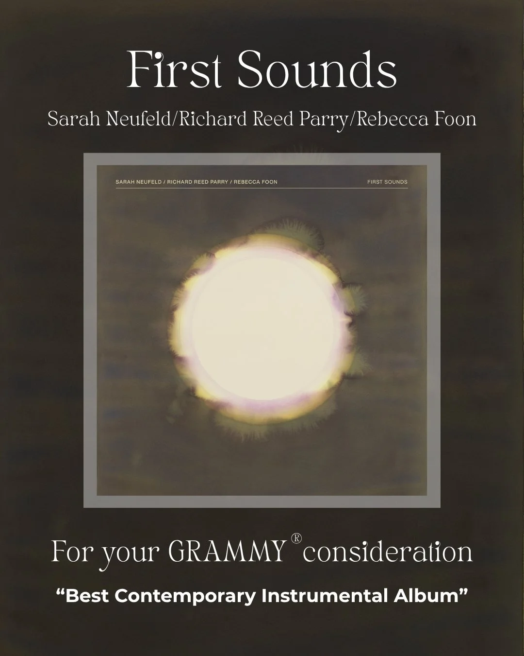 Also up for consideration is Sarah Neufeld / Richard Reed Parry / Rebecca Foon’s debut trio album First Sounds for consideration in the “Best Contemporary Instrumental Album” category. If you are a Grammy voting member, please check it out HERE.